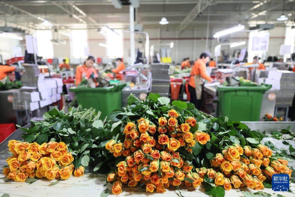 5月24日,在莒县招贤镇曲坊现代农业产业园的鲜切花包装车间,工人在分拣、包装鲜切玫瑰花。