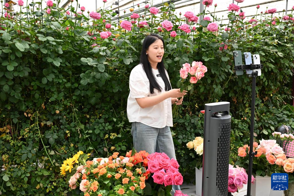 5月24日,在莒县招贤镇曲坊现代农业产业园的玫瑰基地,工作人员通过网络直播销售鲜切玫瑰花。