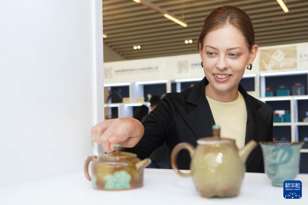 5月23日,一名女子在匈牙利布达佩斯参观中国非遗旅游文创展。