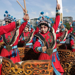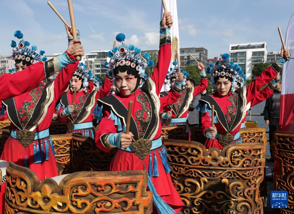 5月24日,中国陕西神木杨家将战鼓在德国法兰克福国际龙舟友谊赛期间表演。