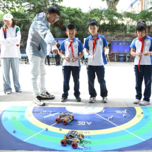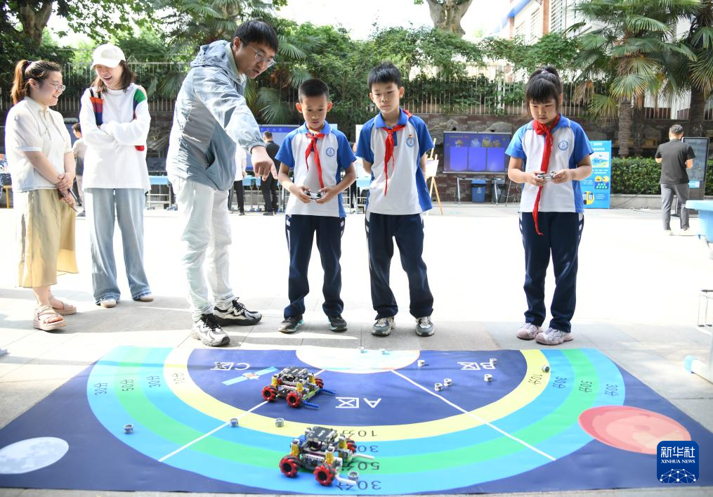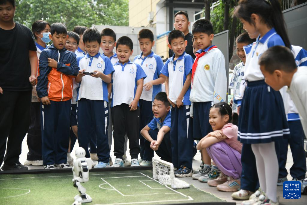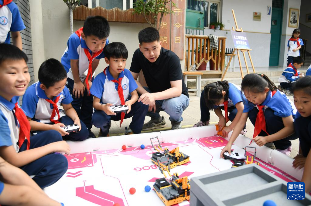 5月26日,在西安市新城区华山实验小学,学生在老师的指导下进行机器人游戏。