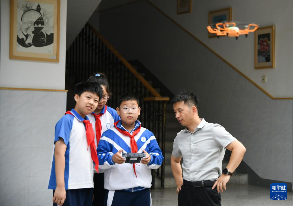 5月26日,在西安市新城区华山实验小学,学生在老师的指导下操作无人机。