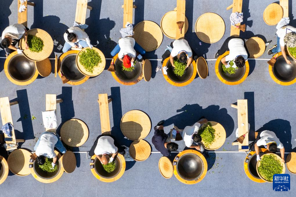 5月26日,在双牌县青龙岩景区,选手在比赛中进行鲜叶杀青(无人机照片)。