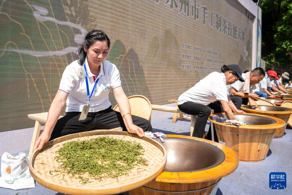 5月26日,在双牌县青龙岩景区,选手在比赛中按照手工制茶工艺制作茶叶。