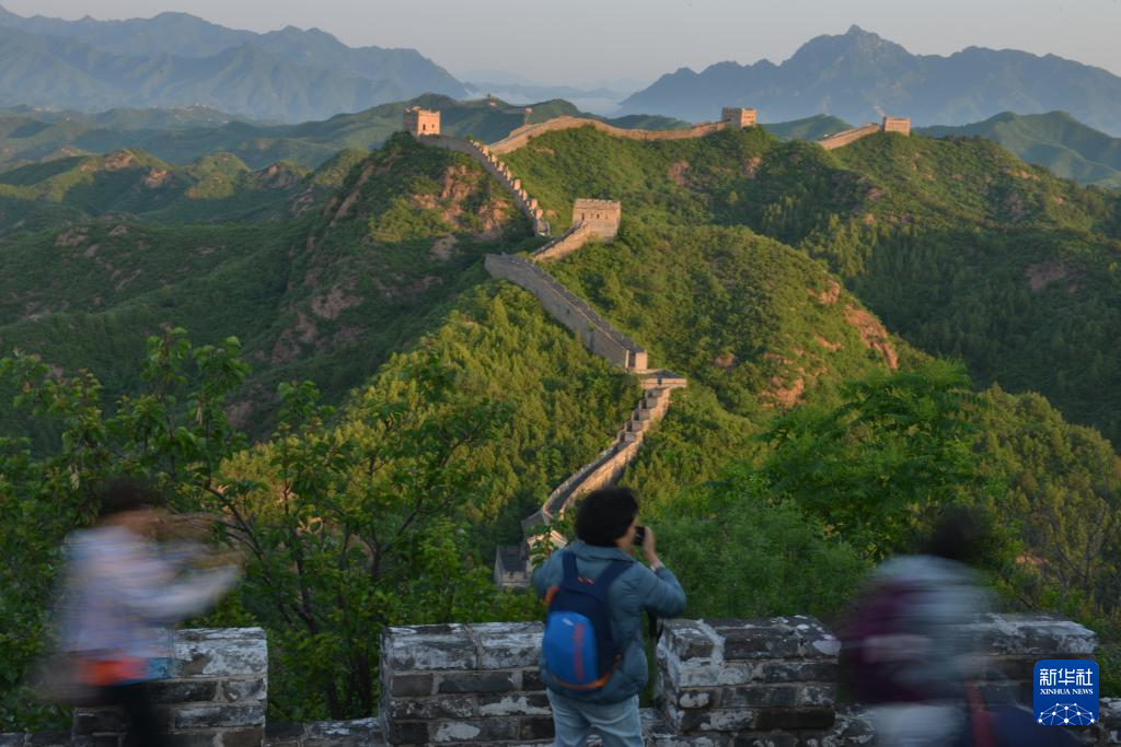5月27日清晨,游人在河北省承德市滦平县金山岭长城游览。