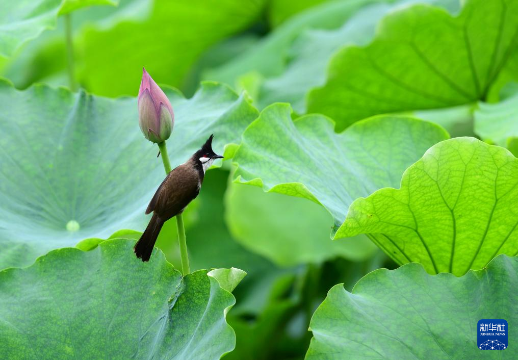 5月26日,在广西贺州市昭平县南池荷雨公园,鸟儿停留在荷花茎上。