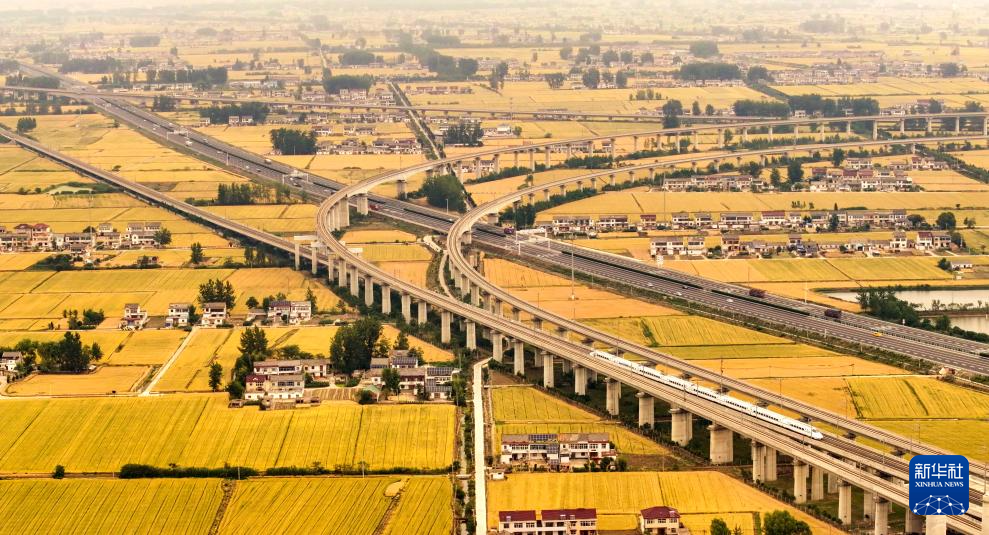 5月26日,一列动车组列车驶过江苏省淮安市淮安区郭湾村麦田(无人机照片)。