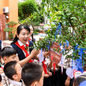 5月30日,在广西南宁市滨湖路小学教育集团滨湖校区少先队员入队仪式结束后,老师与新入队的少先队员们一起种下象征团结的石榴树,并在心愿卡上写下心愿与祝福。