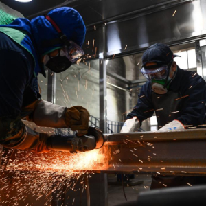 5月30日,工作人员在内蒙古呼和浩特市中国铁路呼和浩特局集团有限公司焊轨段打磨钢轨焊接处。