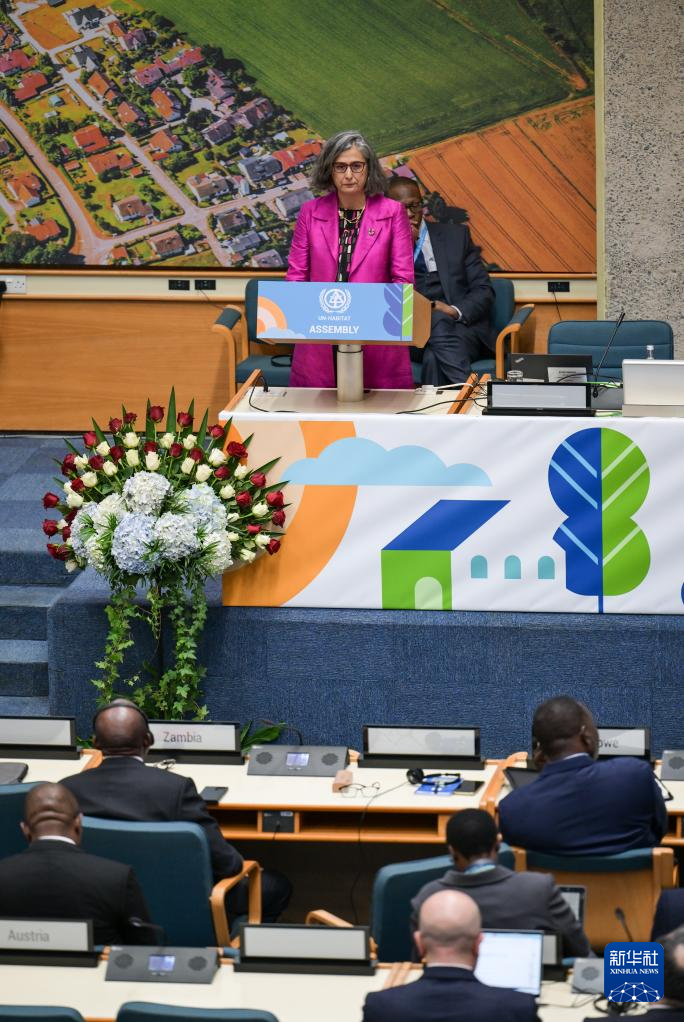 5月29日,在肯尼亚首都内罗毕,联合国人类住区规划署(人居署)执行主任阿纳克劳迪娅·罗斯巴赫在第二届联合国人居大会续会上致辞。