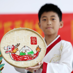 5月31日,在山东省临沂市郯城县郯城街道府东社区,一名男孩展示制作的贴画龙舟。