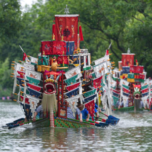 5月31日,村民在杭州西溪国家湿地公园的蒋村龙舟胜会上划龙舟。蒋村龙舟胜会于2011年被列入国家级非物质文化遗产名录。