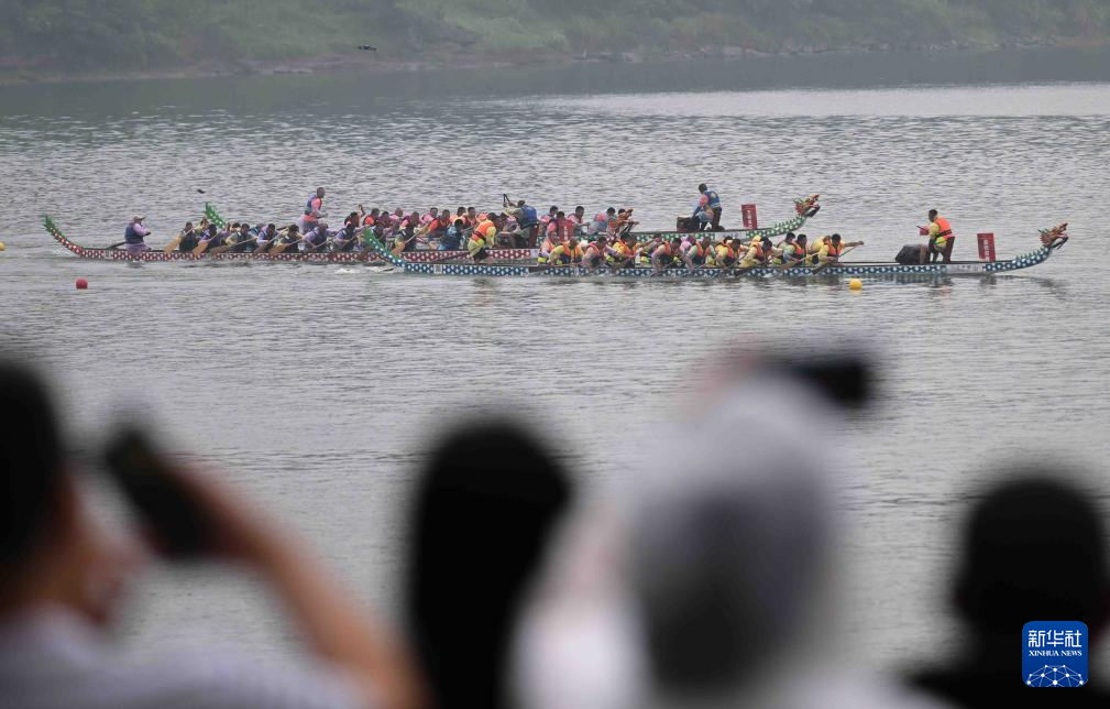 5月31日,在重庆市铜梁区安居古城,参赛队伍在江面上赛龙舟。
