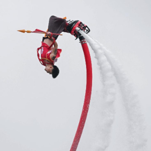 5月31日,在重庆市铜梁区安居古城,水上特技演员表演水上空翻。