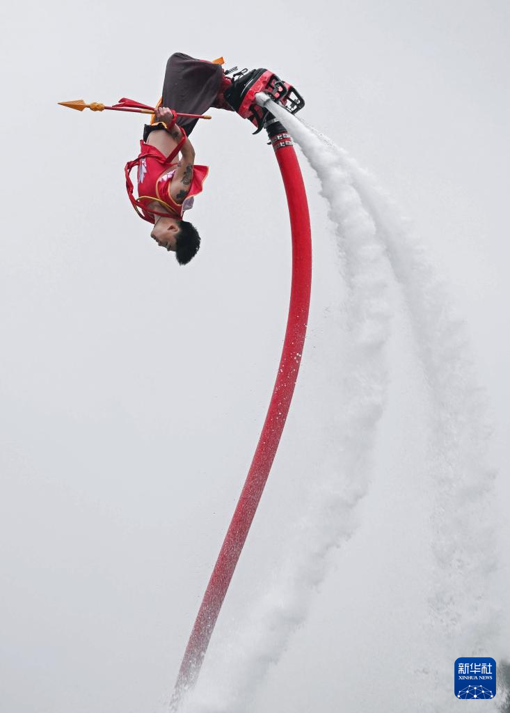 5月31日,特技演员在重庆市铜梁区安居古城进行空中和水上的特技表演。