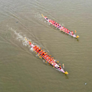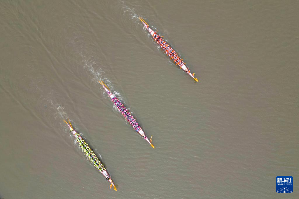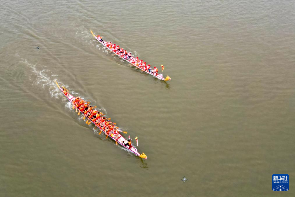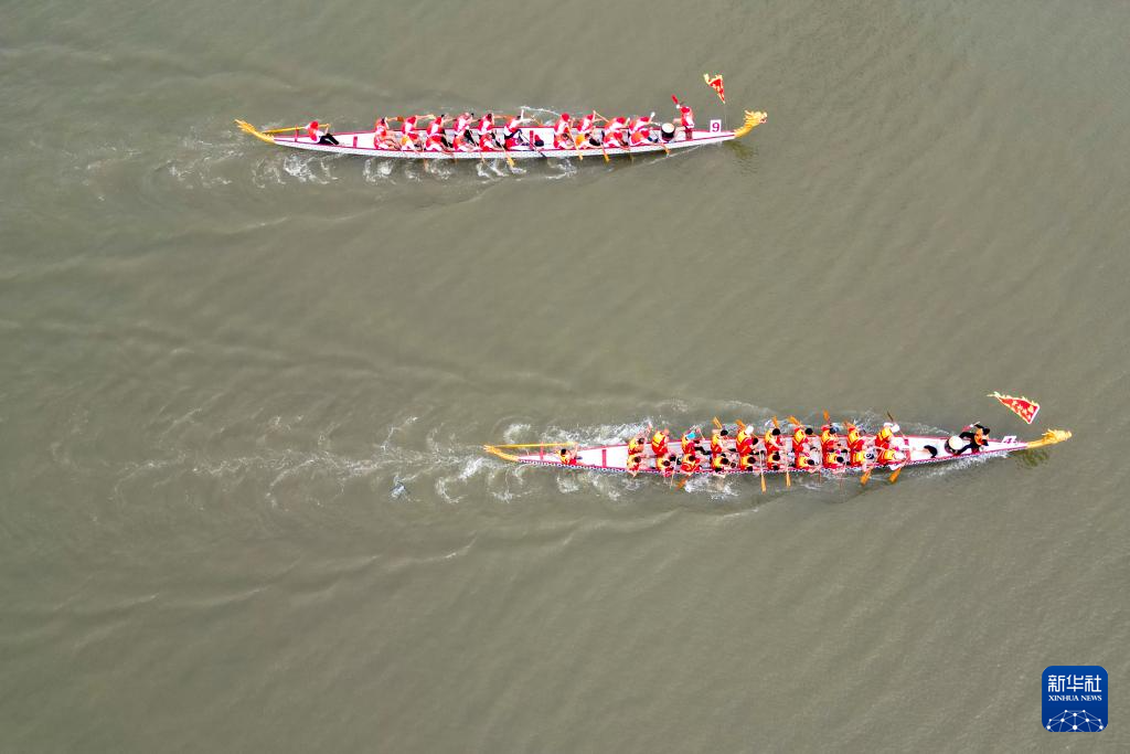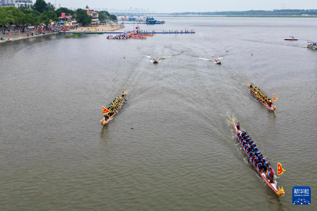 5月31日,在松花江哈尔滨道里区段,参赛队伍在进行龙舟比赛(无人机照片)。