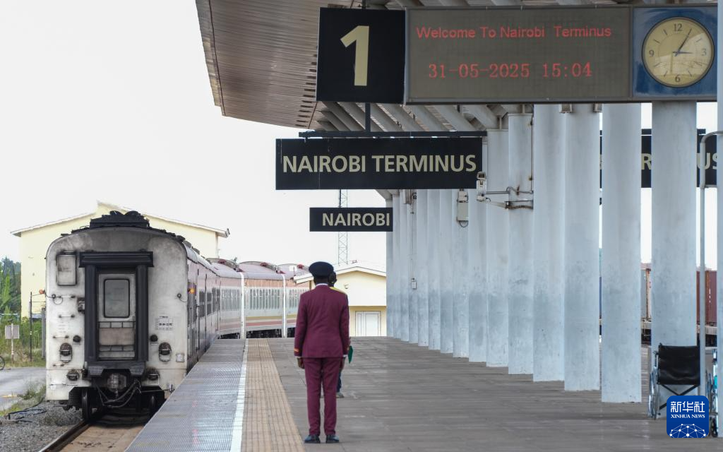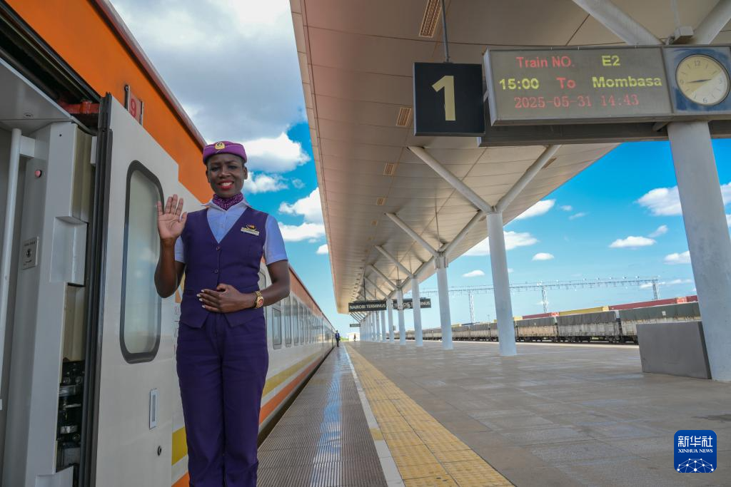 5月31日,在蒙内铁路内罗毕站,一名乘务员在即将开往蒙巴萨的E2次列车旁等候乘客。