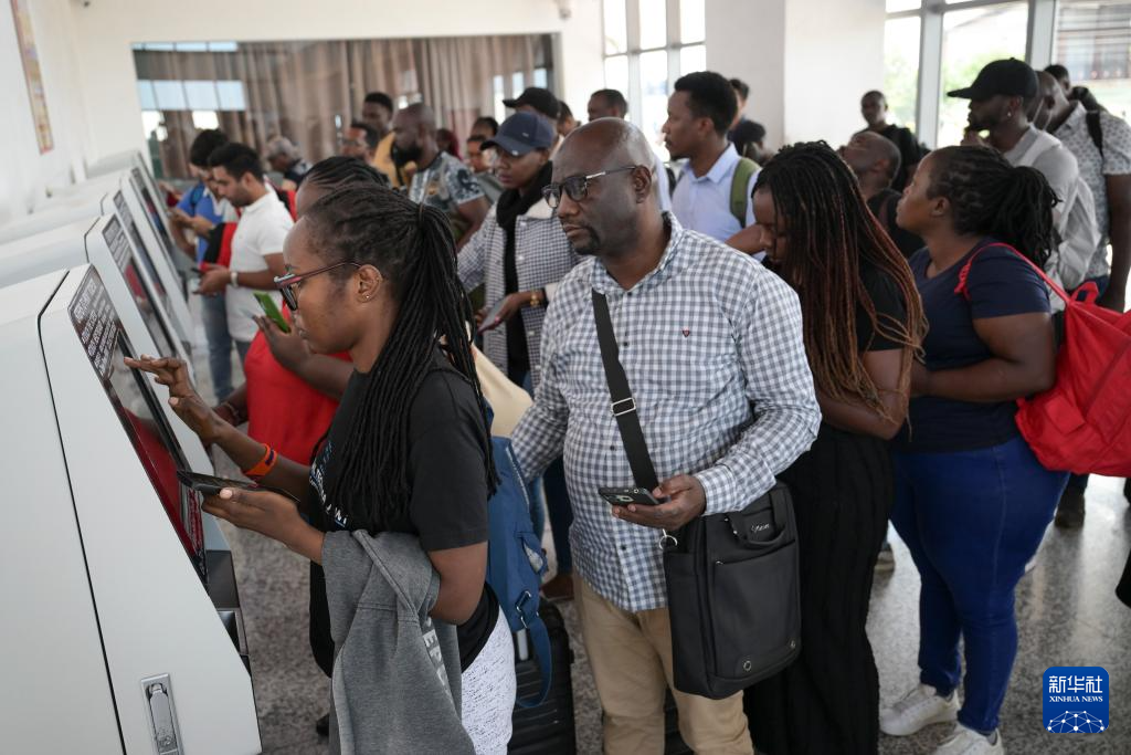 5月31日,在蒙内铁路内罗毕站,乘客在自助取票机前排队取票。