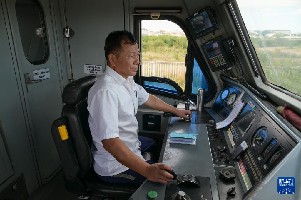 5月31日,在蒙内铁路内罗毕站,机车驾驶员蒋立平在即将开往蒙巴萨的E2次列车上进行准备工作。