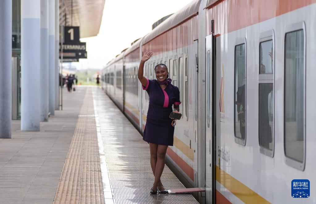 5月31日,在蒙内铁路内罗毕站,工作人员目送开往蒙巴萨的E2次列车驶离站台。