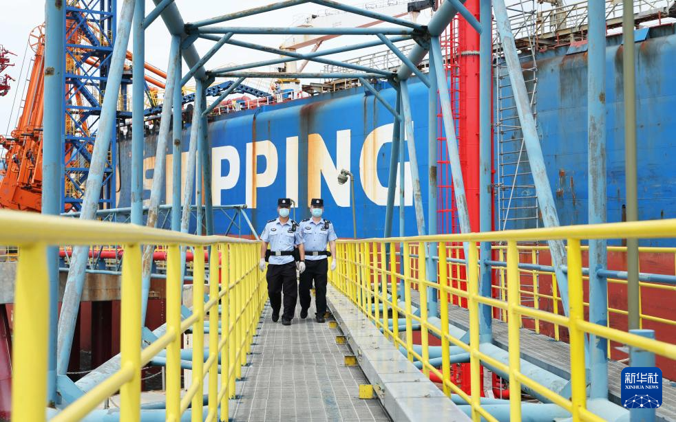 在洋浦港海南炼化原油码头,海口出入境边防检查总站洋浦边检站移民管理警察对外籍船泊进行巡查(5月27日摄)。