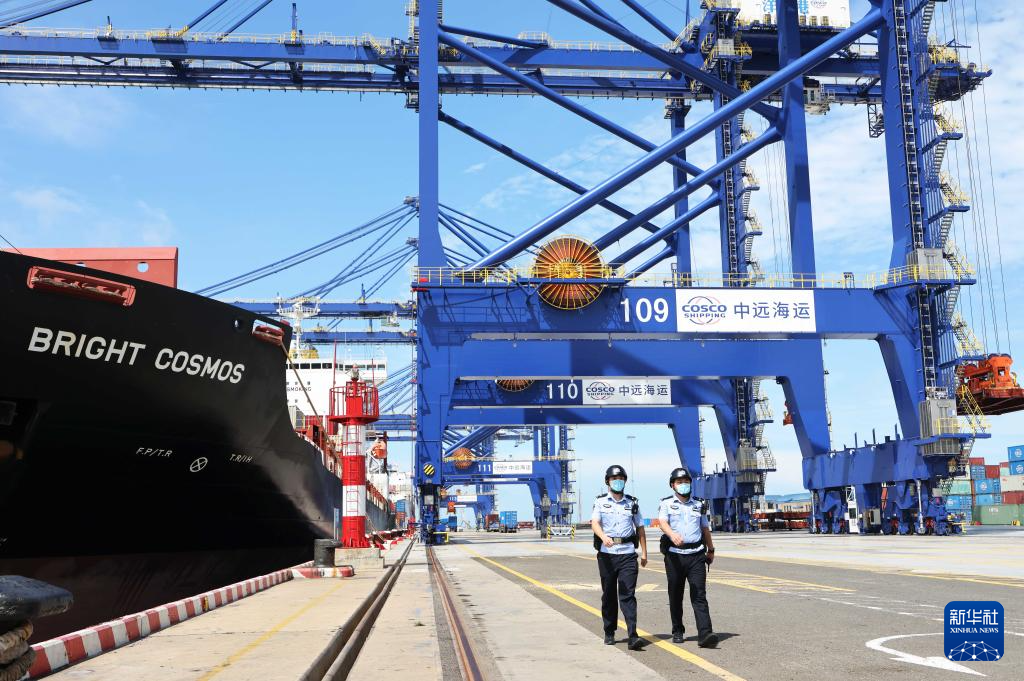 海口出入境边防检查总站洋浦边检站移民管理警察在海南洋浦国际集装箱码头巡查(5月28日摄)。