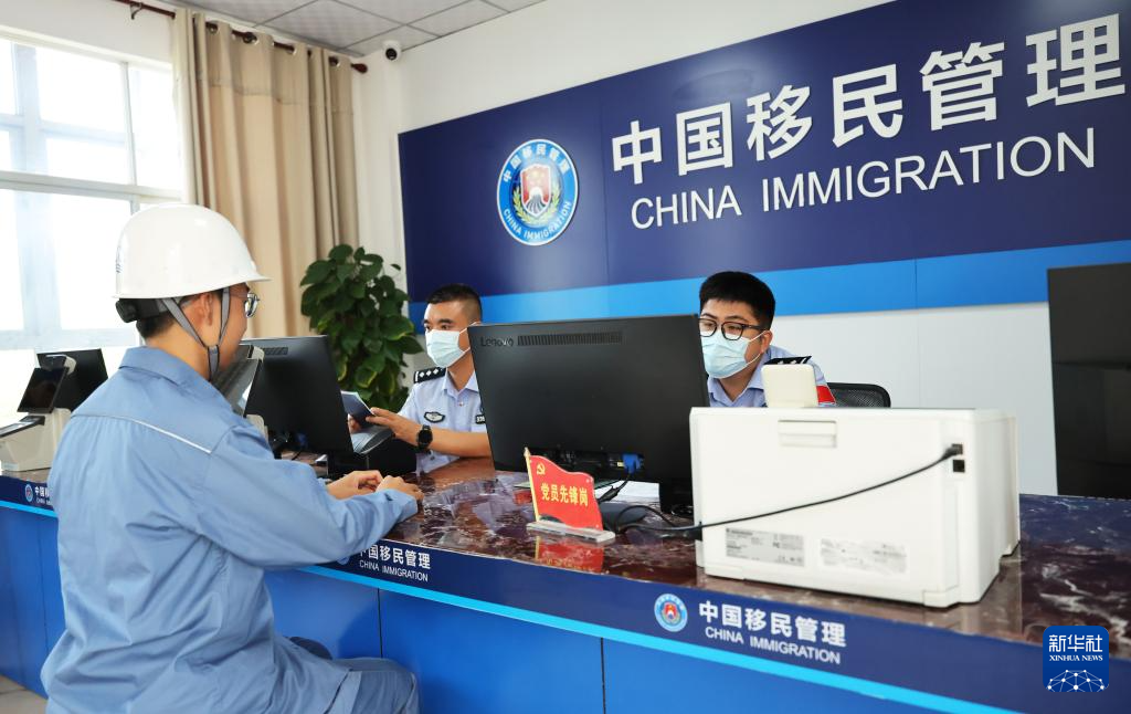 在海口出入境边防检查总站洋浦边检站,移民管理警察为船员办理换班手续(5月27日摄)。边检站通过在口岸指定地点设立联合查验区,将船员出入境检查由“分散式”改为“集中式”,大幅缩短船员换班周转时间。
