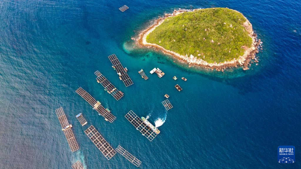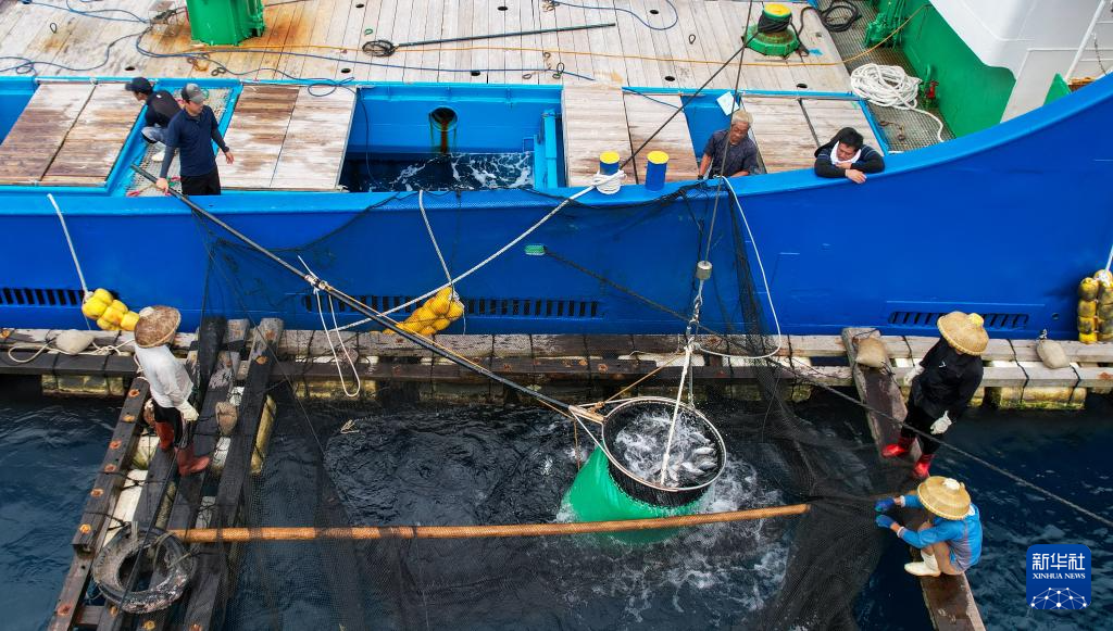 日本籍渔船在海南省万宁市附近海域装运章雄鱼苗(5月15日摄,无人机照片)。