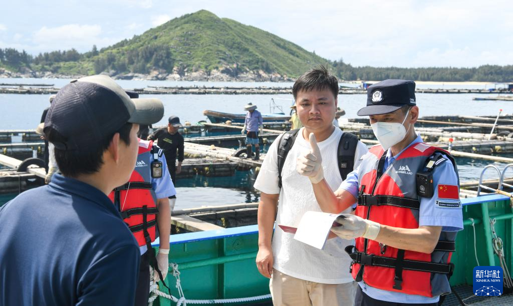 在海南省万宁市附近海域的一艘日本籍鱼苗船上,海口出入境边防检查总站秀英边检站移民管理警察对船员进行人证对照(5月15日摄)。