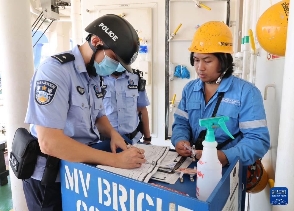 在海南洋浦国际集装箱码头,海口出入境边防检查总站洋浦边检站移民管理警察对外籍船泊进行巡查(5月28日)。