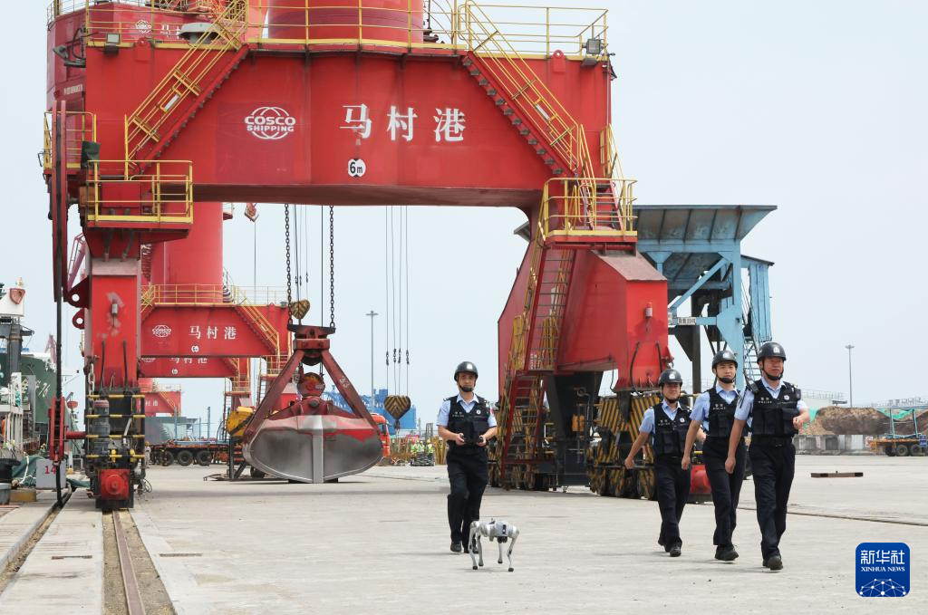在海南省澄迈县马村港码头,海口出入境边防检查总站马村边检站移民管理警察借助机器狗进行巡查(5月26日摄)。
