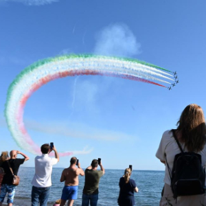 当日,意大利“三色箭”飞行表演队在意大利罗马附近的拉迪斯波利举行的航展上表演。