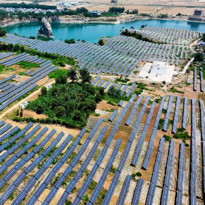 这是6月4日拍摄的菏泽市巨野县核桃园镇青龙山旅游度假区里的光伏发电项目。该度假区是当地对关停矿山、废弃矿坑进行综合治理和生态修复后打造而成的(无人机照片)。