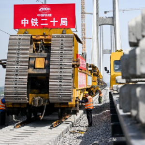 6月6日,在包银高铁乌海黄河特大桥,工人操作工程机械进行铺轨作业。