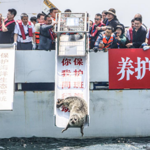 当日,在辽宁大连,5只被救助的西太平洋斑海豹幼崽与4只成年西太平洋斑海豹被放归大海。