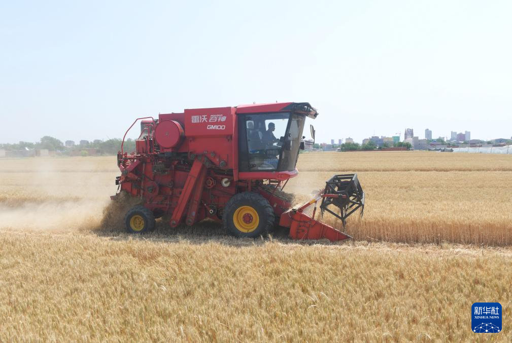6月10日,联合收割机在河北省石家庄市栾城区柳林屯乡东牛村麦田里收割。