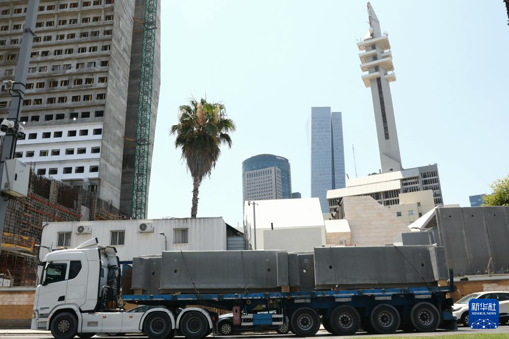 6月13日,车辆在以色列特拉维夫街头运输大型掩体墙。