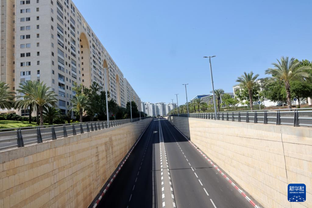这是6月13日在以色列中部城市莫迪因拍摄的空旷的道路。