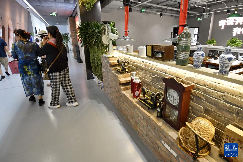6月11日,市民在砖窑里园区内的怀旧主题餐厅参观。