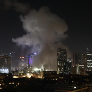 6月13日,在以色列特拉维夫,一栋大楼被导弹击中后升起浓烟。