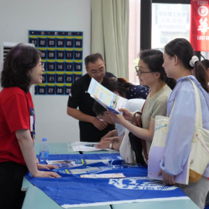 6月15日,河海大学的招生老师(右)向考生家长介绍相关信息。