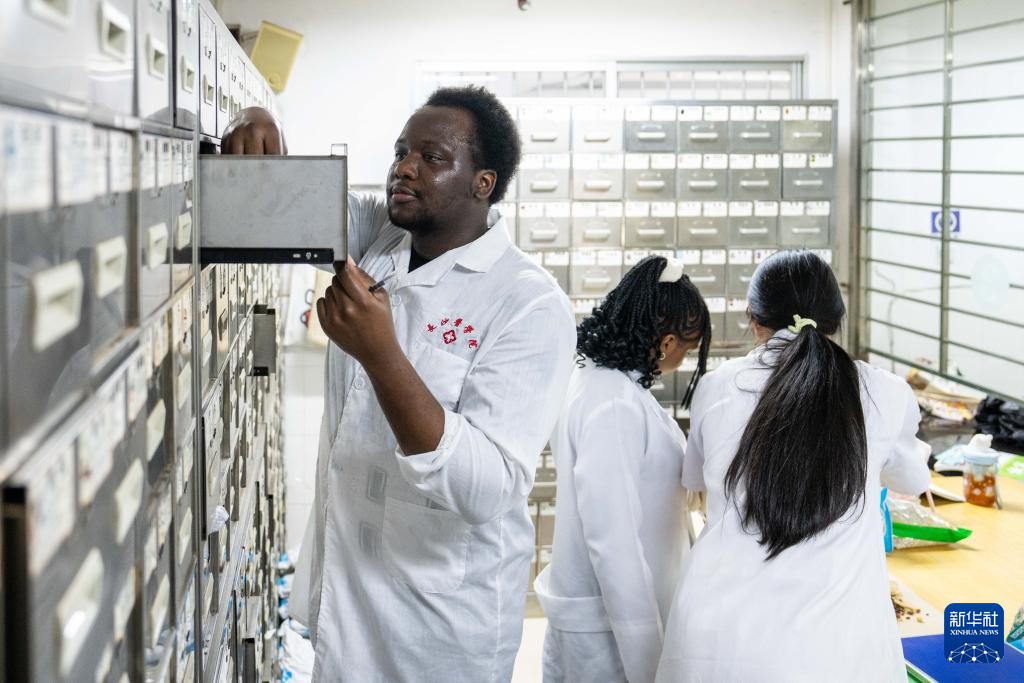 6月18日,在长沙医学院附属第一医院,赞比亚籍留学生卡加(左)在抓中药。