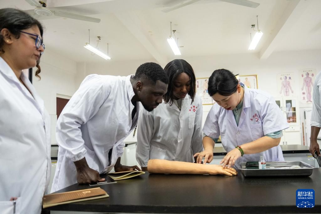 6月18日,在长沙医学院附属第一医院,尼日利亚籍留学生艾明君(右一)与赞比亚籍留学生卡加(左一)学习中医推拿。