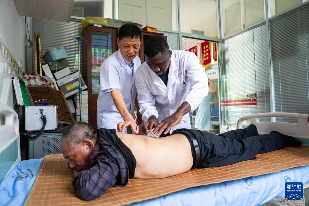 6月18日,在湖南湘江新区金山桥街道金坪社区卫生室,加纳籍留学生亚瑟(右)为社区老人推拿、义诊。