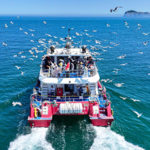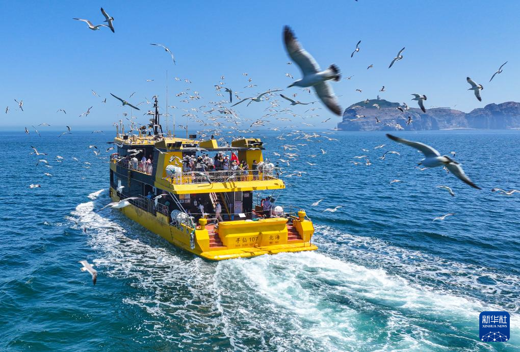 6月23日,在山东省荣成市海驴岛海域,游客们乘船体验,并与黑尾鸥互动(无人机照片)。