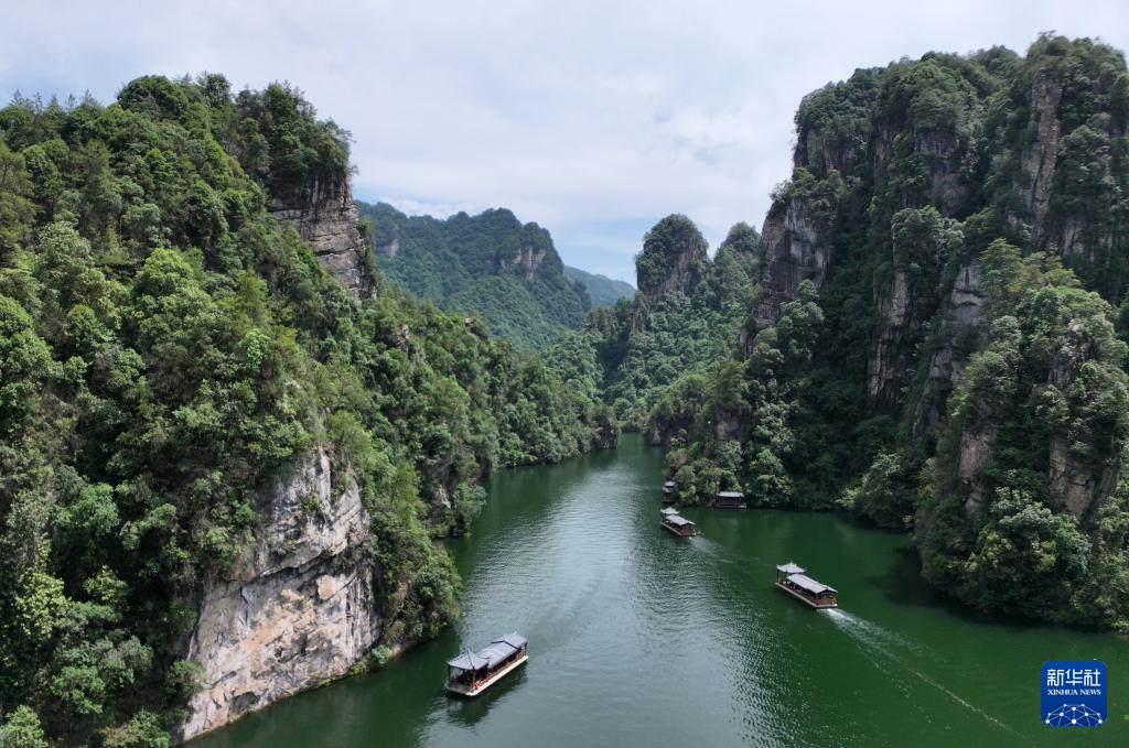 6月16日,游人在湖南张家界宝峰湖景区乘船游览(无人机照片)。