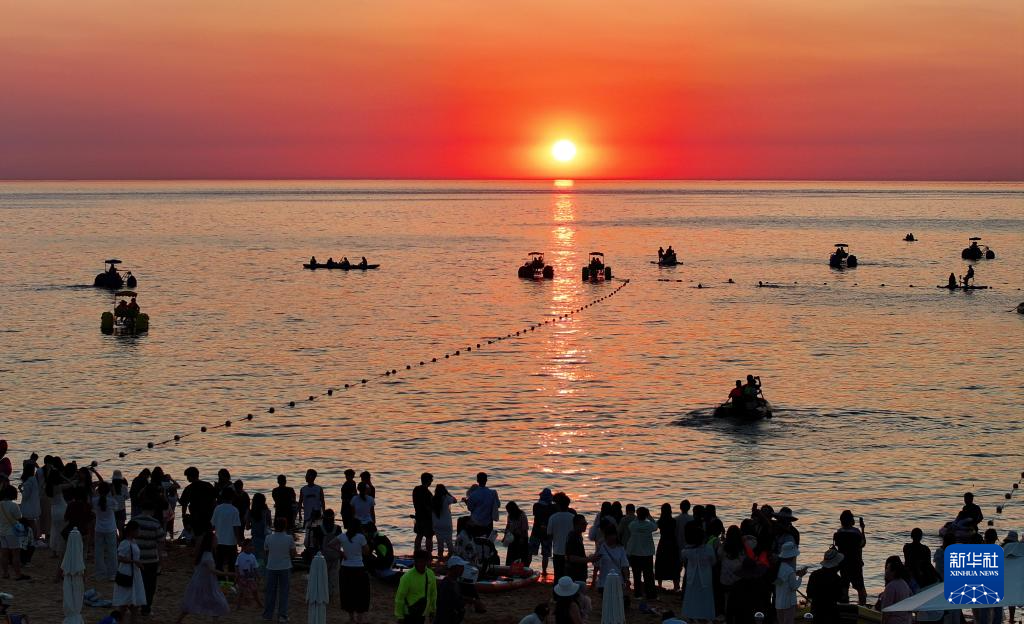 6月22日傍晚,游客在山东威海国际海水浴场赏晚霞纳清凉。