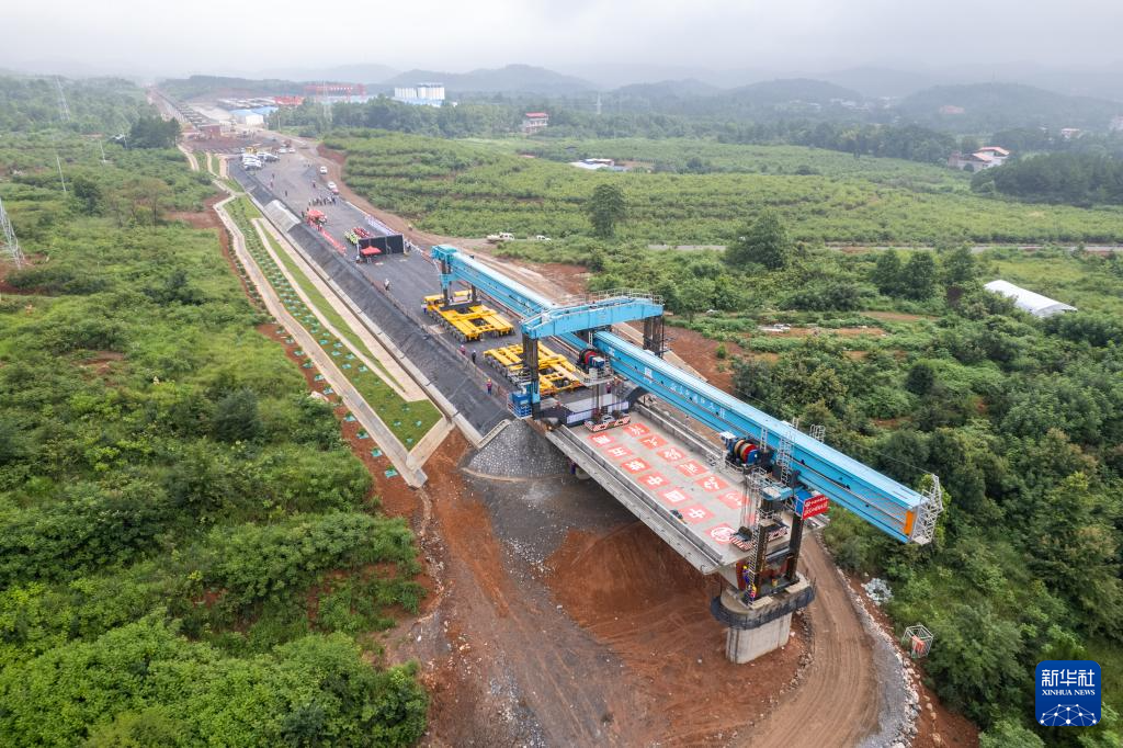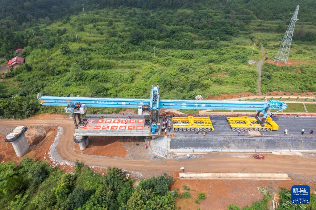 6月25日拍摄的邵永高铁柘刺坪特大桥架梁施工现场(无人机照片)。