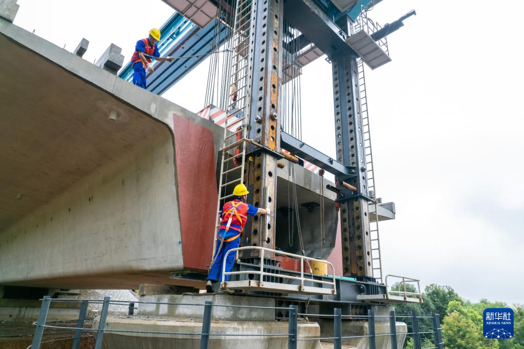 6月25日,在邵永高铁柘刺坪特大桥建设工地,中铁五局工人在进行架梁施工作业。