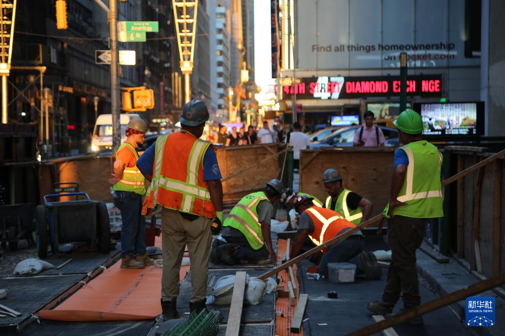 6月24日,建筑工人在美国纽约曼哈顿街头工作。